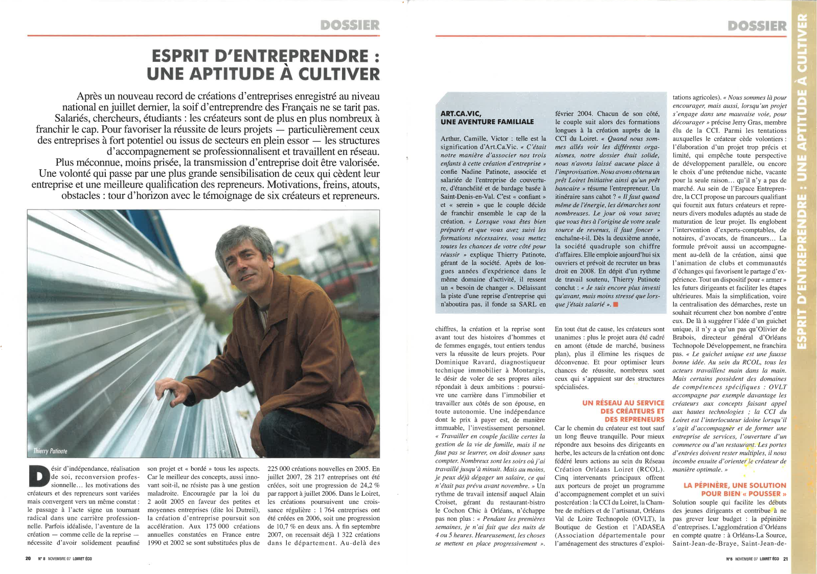 Dans le numéro huit de Loire eco en novembre 2007, paraissait un article intitulé "l'esprit d'entreprendre, une aptitude à cultiver". Cet article était un tour d'horizon avec le témoignage de 6 créateurs et repreneur d'entreprise dans le Loiret, l'un des témoins est Thierry PATINOTE. Il lui explique qu'après avoir envisagé de faire une reprise d'entreprise, il décide finalement en février 2004 de fonder, avec son épouse, la SARL ART.CA.VIC.