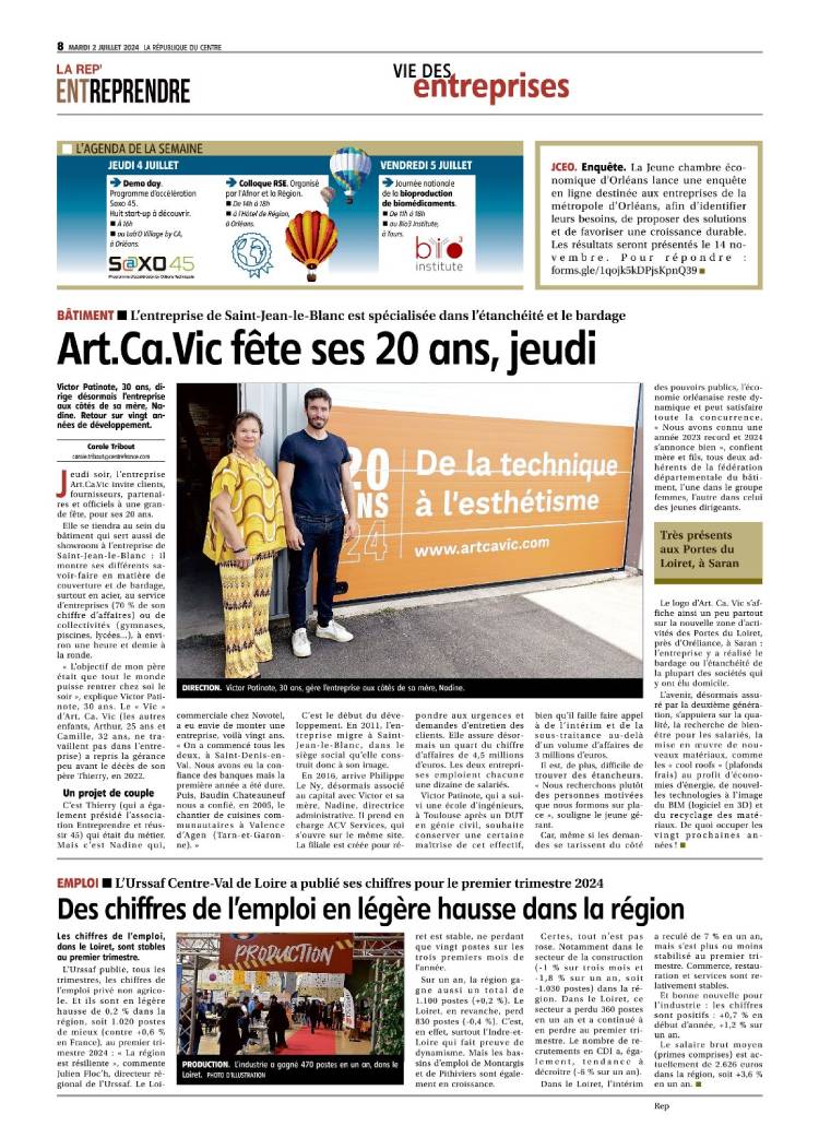 En 2004, Nadine et Thierry PATINOTE ont créé l’entreprise ART.CA.VIC ÉTANCHÉITÉ BARDAGE. Aujourd’hui, elle est dirigée par Nadine et son fils VICTOR, le “VIC” dans ART.CA.VIC. Carole Tribout les a rencontrés et leur a consacré un article dans La République du Centre le 2 juillet 2024, juste avant la soirée anniversaire qui s’est tenue le 4 juillet.